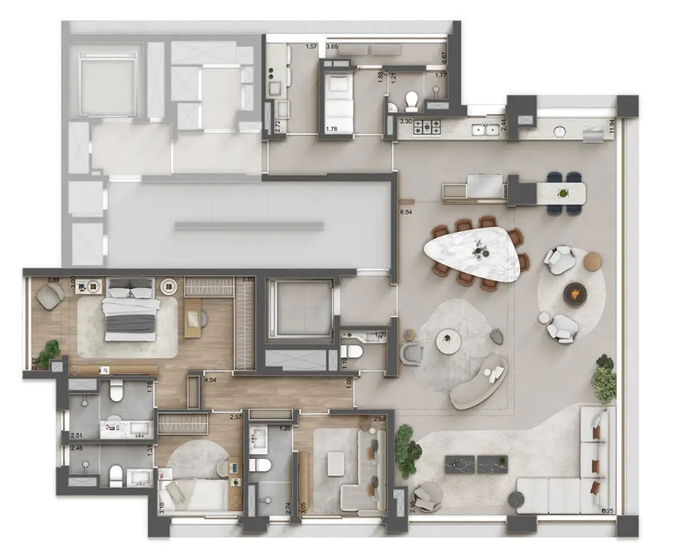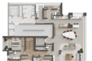 O edifício possui 36 pavimentos e três subsolos, abrigando unidades residenciais de diferentes tipologias: apartamentos de aproximadamente 178 m² com três suítes e duas vagas de garagem, além de unidades duplex de 276 m² com quatro suítes. Cada espaço interno foi planejado para proporcionar amplitude, iluminação natural e acabamentos sofisticados, garantindo um padrão elevado de moradia.